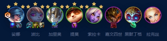 我们这套阵容是一套非常强力的冷门阵容是S9版本的恢复超强的阵容媲美八仙女前期可以开3德玛2堡垒过渡装备给天使。