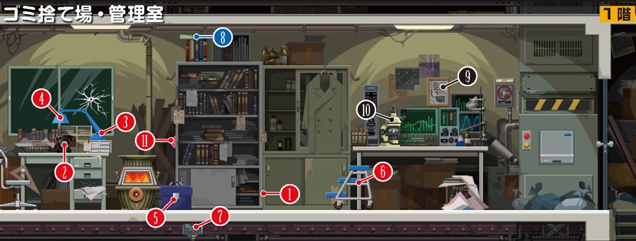 向下转移至雨伞并打开,按第一章的方法转移至电话亭,切换场景至垃圾场的管理室。