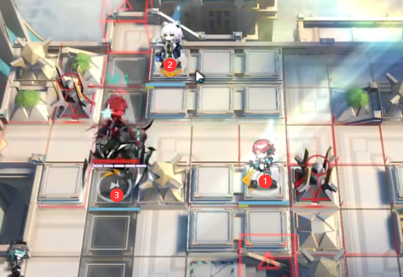 如图所示位置部署能天使向右,凯尔希向左,部署Mon3tr技能好了就开。