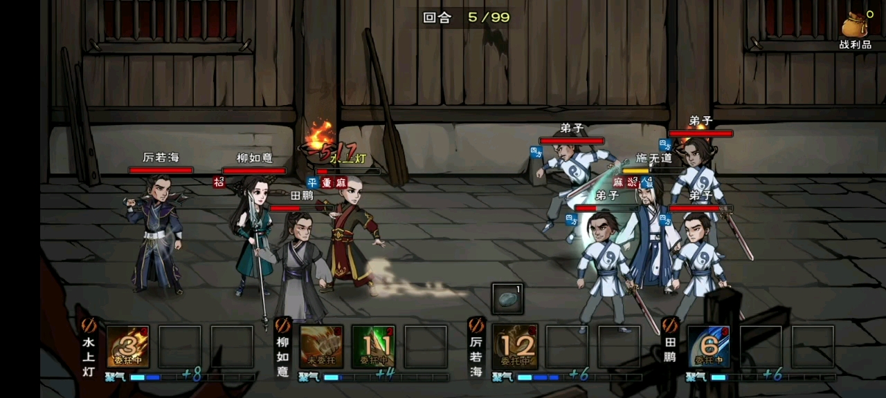 八极阵:四个弟子站有『四方』效果加成,增加攻防,施无道每回合获得一个,当杀死两名弟子时将会变阵,施无道站头阵其余两名站其身后,且此时会施展『极灭』对每列造成伤害并上debuff,无法聚气和施展招数并每回合减少大量内力,持续两回合。