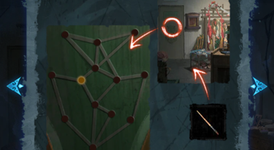 11、使用沾有红色油彩的化妆笔,在门上的脸谱上完成一笔画,打开通向仓库的门。