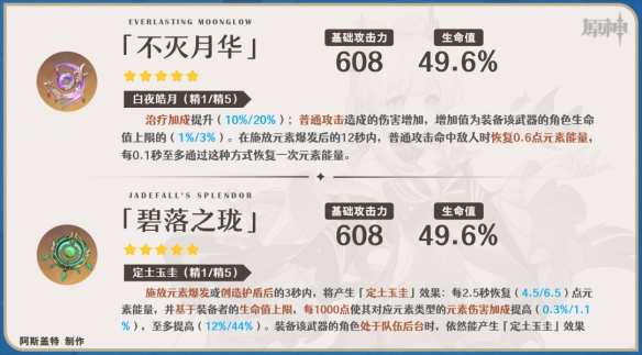 ①试作金珀:在不抽取不灭月华的前提下,该武器通过锻造获得。相较其他武器性价比较高,优化自身循环的同时还可进一步回复全队的治疗量。
