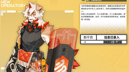人物简介:五星重装干员,经龙门鲤氏侦探事务所所长老鲤推荐而来的重装干员。体格高大,体能极强,在前线为其他干员提供可靠的保护