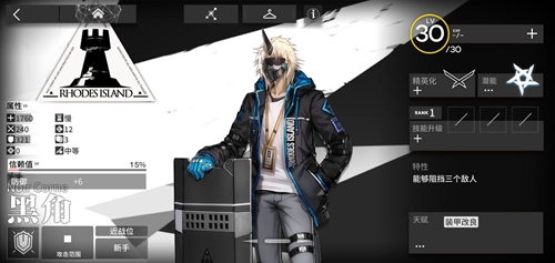 因为是二星低星角色,该角色不适合去进行专精的操作,会浪费很多的资源,作为两星干员的黑角没有技能,但在30级后会解锁天赋“装甲改良”,使自身的生命上限和防御力各+12%,使肉度略微提高,只适合前期的过渡使用,抽到更好的干员替换即可