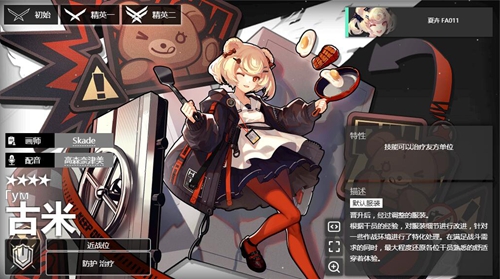 人物简介:四星重装干员,曾取得全乌萨斯童子军活动大赛青少年组亚军,切尔诺伯格事变前于切城某中学就读,于多项测试中表现出乌萨斯人与生俱来的强健力量和坚实体质,获准作为实习重装干员加入战斗,并为罗德岛提供后勤保障与战地烹饪等相关服务