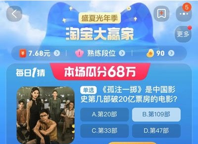 《孤注一掷》是中国影史第几部破20亿票房的电影?淘宝天猫618正在火热进行当中,这题是淘宝天猫618当中的问题,其实这是淘宝2023年上线的618新活动,请各位小伙伴们不要着急,下面是小编为大家带来的8月16日618的答案,一起跟着小编一起往下面看看吧。