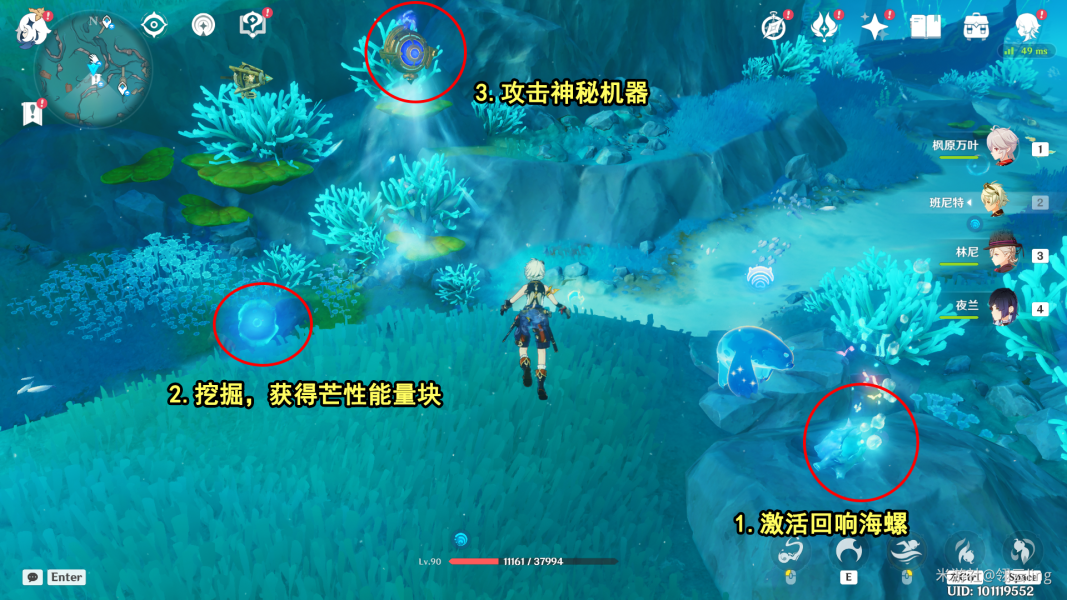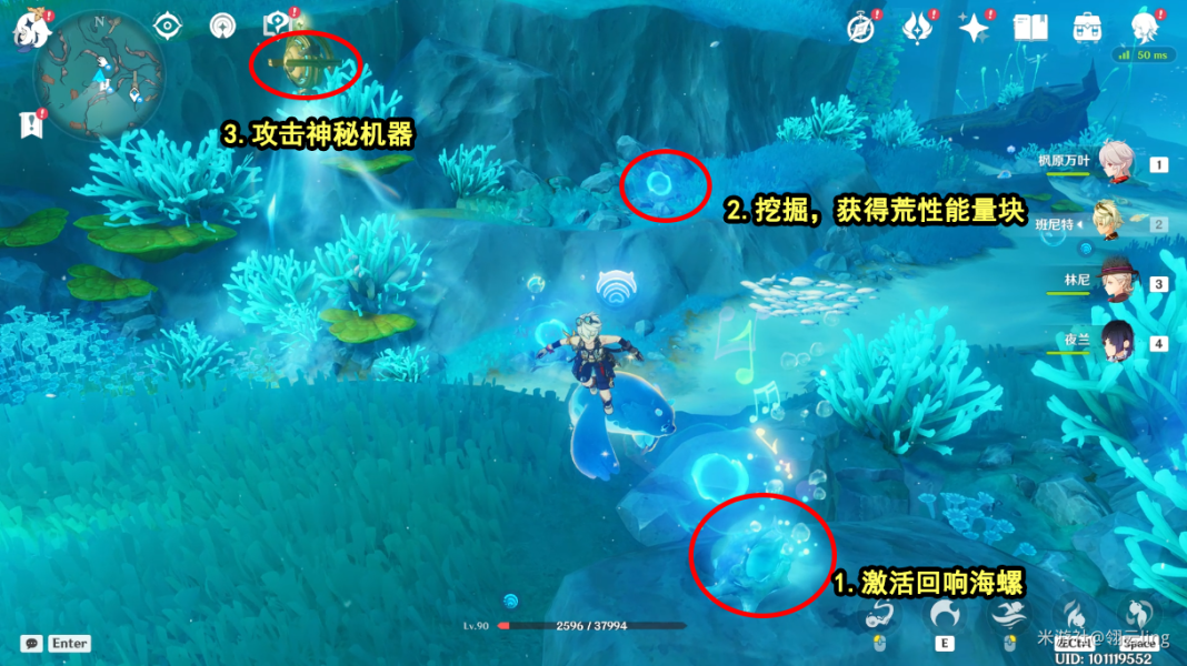 2、到达之后将回声海螺激活,然后挖掘左边位置的提示点获得荒性能量块,去攻击神秘机器;