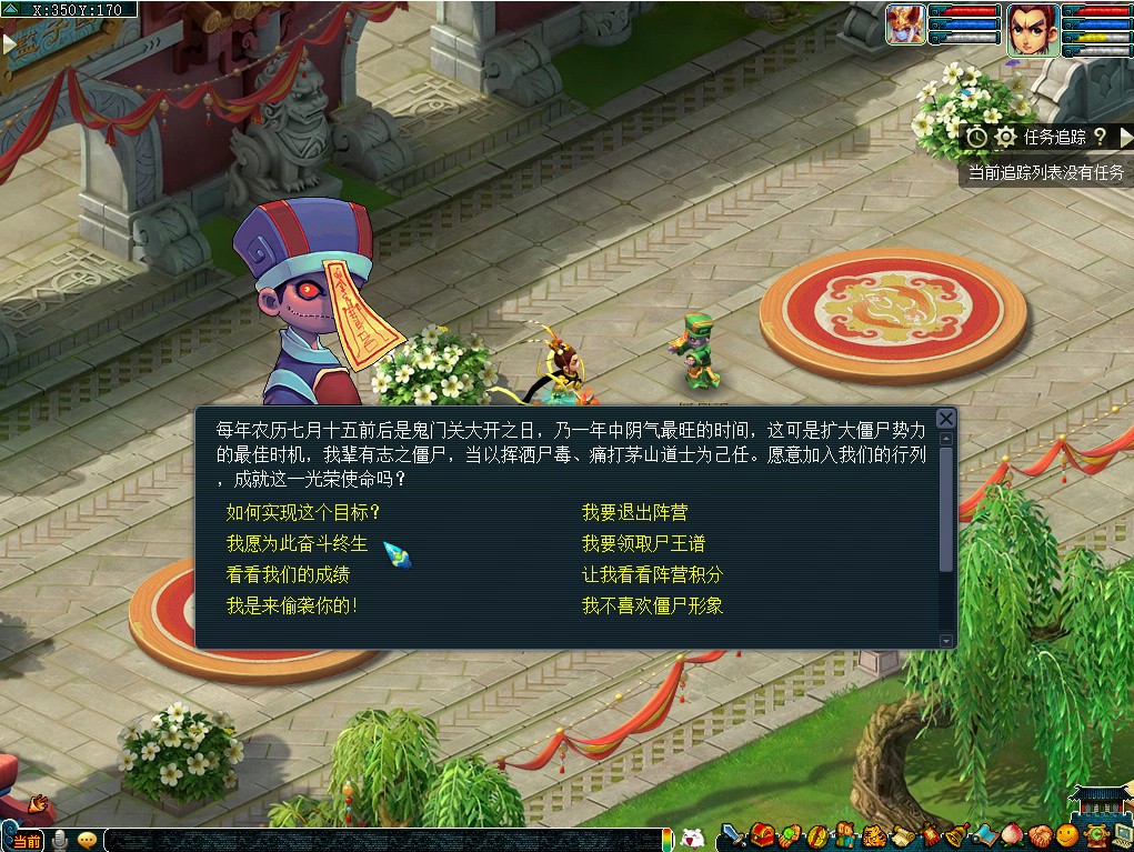 活动期间,玩家可在长安城(356,172)寻找僵尸王加入僵尸阵营,或者到长安城(413,206)寻找茅山道士加入道士阵营。加入阵营后,即可学习阵营专属技能。