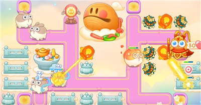 1、用炮弹炸钱袋,用多重箭抵御攻击,兔子到多重箭处绕过围栏。