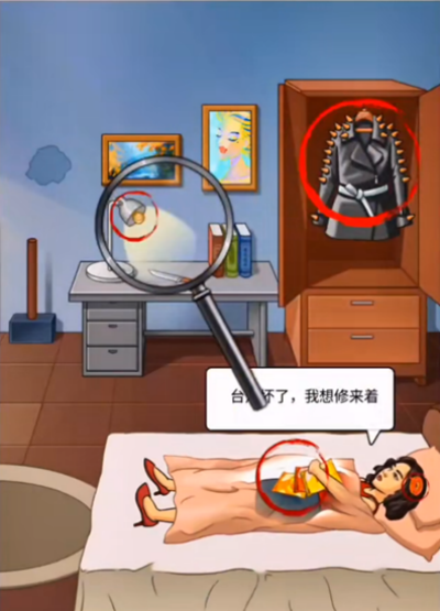 1、点击大嫂的肚子、头上的甜甜圈、衣柜衣服的妙脆角、台灯的灯泡;