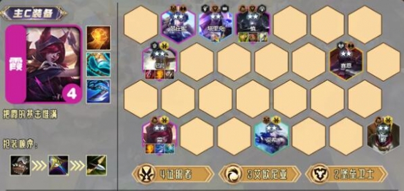 阵容4-1七级要D一波,找一张霞开四征服,配一定质量的前排即可上八,尼菈没来前用诺手;