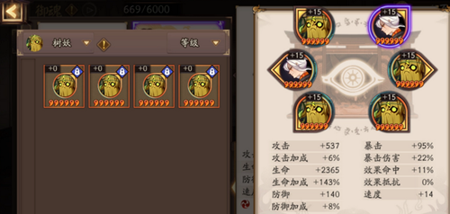 治疗型式神的标配御魂,利用树妖治疗量加成的特性使樱花妖拥有更强的回复能力,御魂主属性二号位速度,四号位效果抵抗,六号位生命加成,副属性堆生命加成