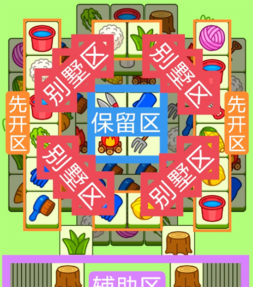 四个斜着的长型别墅组成,开局先消除橙色区,然后按照一层层均匀消除表面牌, 哪里压牌比较多就先消除哪里,必要时可以用盲盒区辅助消除表面牌。尽量还是以别墅区内互相消除为主。蓝色区有叠牌,但是不多,全部保留到后期使用。