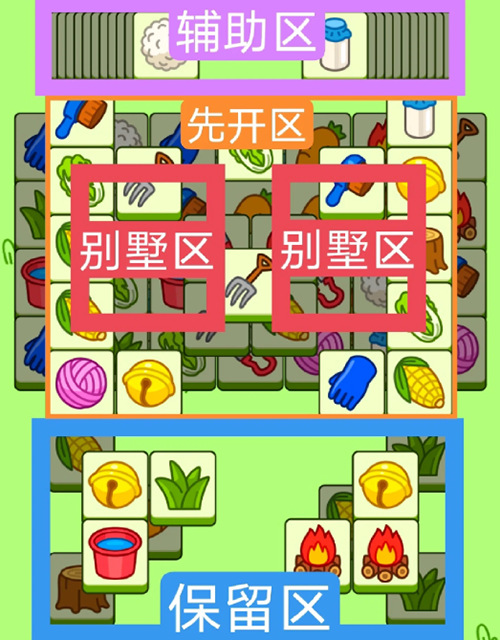 四个双叠牌小别墅,一个V字型大别墅,开局先消除橙色区,然后按照一层层均匀消除表面牌, 哪里压牌比较多就先消除哪里,必要时可以用盲盒区辅助消除表面牌。尽量还是以别墅区内互相消除为主。蓝色区有叠牌,但是不多,全部保留到后期使用。