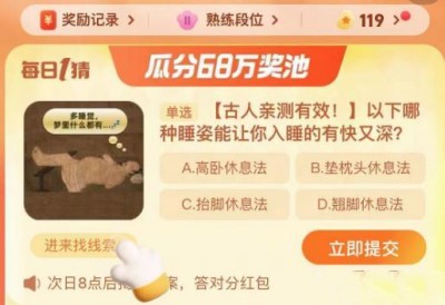 【古人亲测有效! 】以下哪种睡姿能让你入睡的有快又深?淘宝天猫618正在火热进行当中,这题是淘宝天猫618当中的问题,其实这是淘宝2023年上线的618新活动,请各位小伙伴们不要着急,下面是小编为大家带来的9月18日618的答案,一起跟着小编一起往下面看看吧。