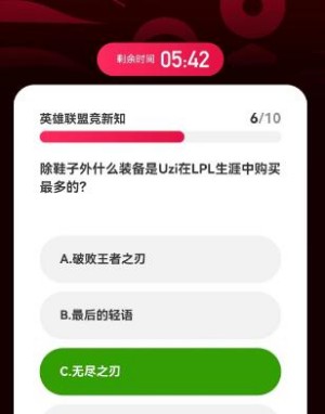 6、除鞋子外什么装备是Uzi在LPL生涯中购买最多的?答案:无尽之刃;