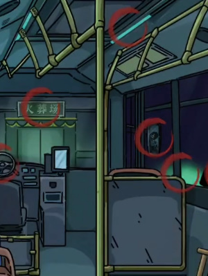 1、进入游戏后玩家要找出公交车的诡异之处,车子里转动的方向盘,车顶的到站提示变成了火葬场,车内灯光幽暗,留在车厢里的手提包,点击后视镜会出现一个恐怖的洋娃娃,车子窗外有影子,车窗外闪烁着诡异绿光。