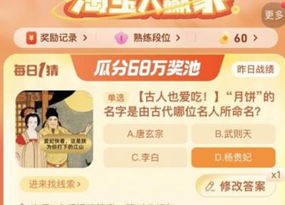 《淘宝》618活动目前已经开始了,官方也是推出了每日一猜的瓜分68万奖池活动,每天玩家们都可以通过答题瓜分百万红包,今天小编给大家带来的是淘宝大赢家2023年9月19日的问题“古人也爱吃!月饼的名字是由古代哪位名人所命名?”这道题目的答案是什么呢,让我们一起来看看吧。