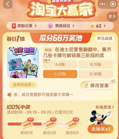 《淘宝》618活动目前已经开始了,官方也是推出了每日一猜的瓜分68万奖池活动,每天玩家们都可以通过答题瓜分百万红包,今天小编给大家带来的是淘宝大赢家2023年9月20日的问题“迪士尼爱意翻翻中,集齐几张卡牌可解锁第三阶段的奖池?”这道题目的答案是什么呢,让我们一起来看看吧。