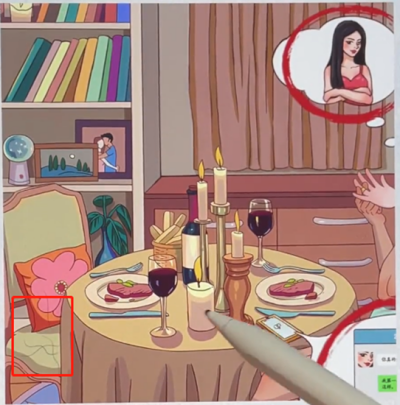 1、点击女人手里的照片、白框里的女人、口红印、戒指;