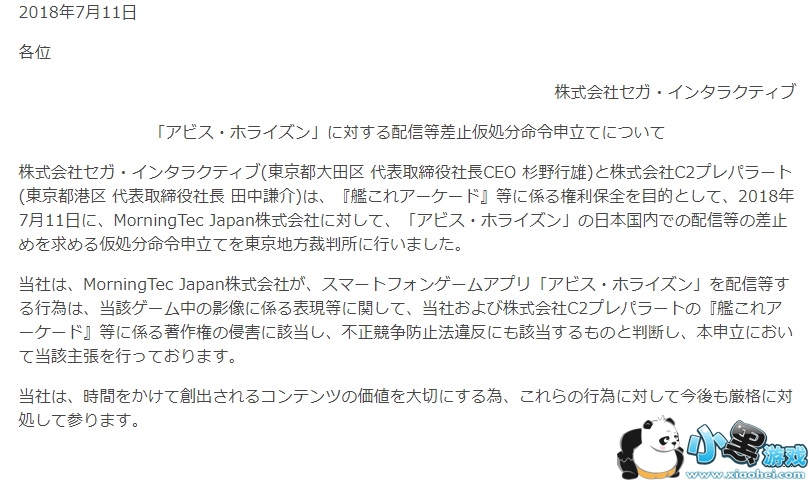 根据世嘉官方公告,世嘉社长杉野行雄与会同C2机关社长田中谦介,以保护《舰队收藏》之权益,向东京地方法院申请禁止《深渊地平线》上市发行。其中声明稿中特别强调《深渊地平线》的画面与其它内容侵害了《舰队收藏》著作权,判断对方违反日本不正竞争防止法才提出起诉。
