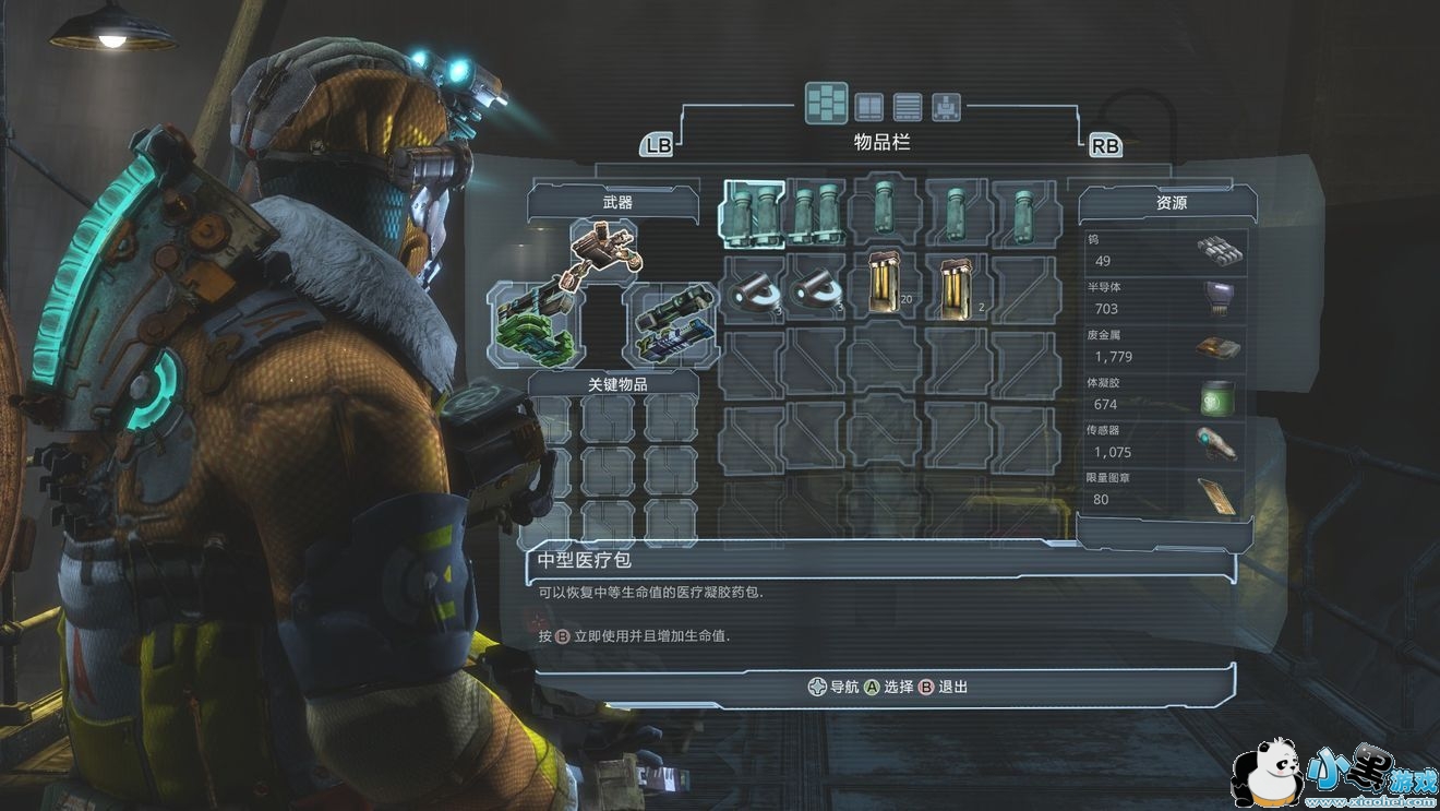 《死亡空间》系列的HUD隐藏系统。角色的血量和能量都显示在背后的光缆中,而非直接显示。
