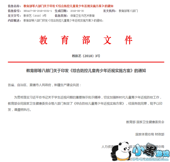游戏观察8月31日消息,习近平总书记近日就我国儿童青少年近视高发问题作出重要指示,要求有关方面结合深化教育改革,拿出有效的综合防治方案,共同呵护好孩子的眼睛,让他们拥有一个光明的未来。为贯彻落实习近平总书记重要指示精神,教育部、国家卫健委等八个部委在公开征求意见后,于昨天正式公布《综合防控儿童青少年近视实施方案》。《实施方案》提出了家庭、学校、医疗卫生机构和学生等方面应采取的防控措施,明确了八个相关部委在防控儿童青少年近视方面的职责和任务,并首次明确:青少年近视率将纳入政府绩效考核。