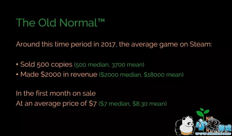 2017年2月份的时候,Steam平台平均每款游戏的首月销量的中位数是500套(平均销量是3700套),中位数收入是2000美元(平均收入1.8万美元),中位数定价是7美元(平均定价为8.3美元)。注:中位数指的是从高到低位于中间的数字,而平均值则是所有销量累计除以游戏数量的数字,由于头部游戏占收入较高,因此对于普通开发者来说,中位数更有参考价值。