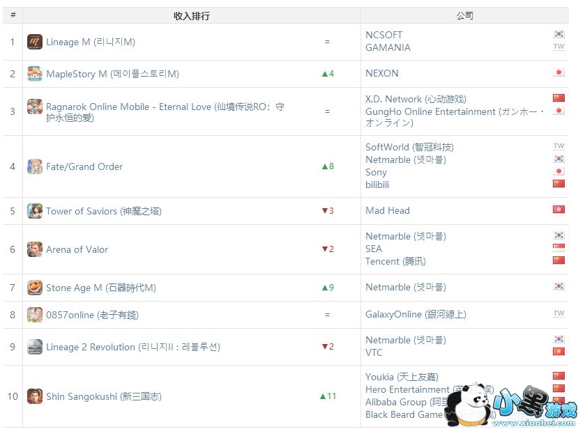 带着经典IP的《新三国志》在港澳台地区一直有着出色的表现,此次8月份在中国台湾畅销榜上也上升11名闯入前10。而除了《Fate/Grand Order》持续出色表现外,值得关注的是《冒险岛M》和《石器时代M》,前者延续上个月空降第6的抢眼表现,此次更进一步来到第2的位置;而后者则上升9名位居第7,可以看出画风更加卡通轻快、带有经典网游IP的手游版是中国台湾市场玩家亲睐的一种类型。