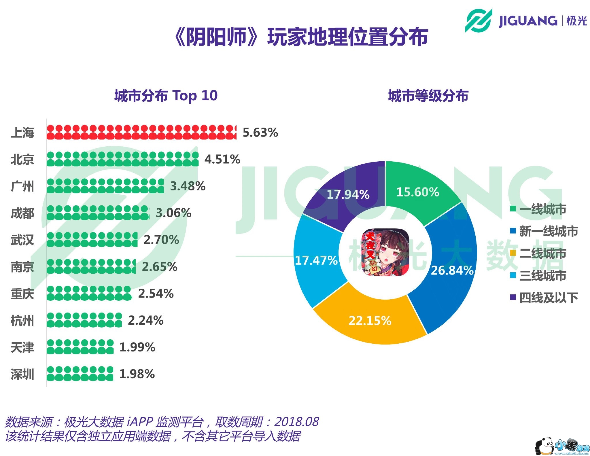用户城市分布结果显示,《阴阳师》玩家占比最高的城市依次为上海、北京、广州和成都,4个城市所占的用户比例分别为5.63%、4.51%、3.48%和3.06%,其余城市的用户占比均不足3%。