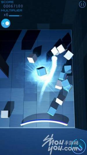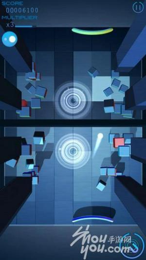 游戏画面:游戏的色调偏向冷色调,简单的3D几何图形构建起一个充满未来科技感的空间。场景也是3D建模,其好处在于赋予场景更加复杂的物理变化,跳脱出传统“打砖块”游戏的平面无力感。