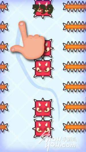 游戏介绍:《手指历险记 Mmm Fingers》玩家需要用一根手指按住屏幕,一边避开屏幕上出现的小怪兽、尖刺棒等障碍,一边长按并滑动屏幕,不可以松手。只要触碰到屏幕,游戏里就会显示手指所触碰到的位置,玩家大可参照屏幕的手指所在位置来进行移动躲避。