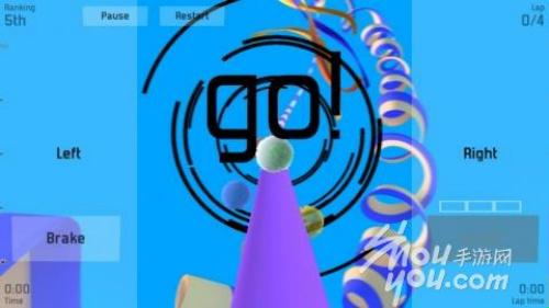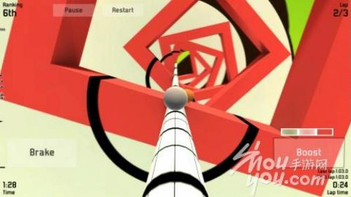 游戏初印象:游戏中的“赛车”被抽象为一颗在缆绳上滚动的小球,虽然这看上去十分不平稳,不过你不必担心它会突然脱离轨道,只需要集中注意力别碰上其他障碍物就可以了。