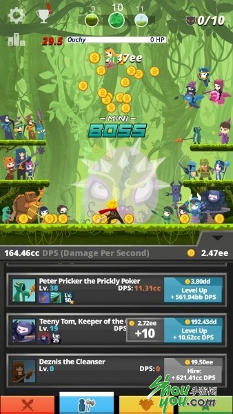 好的,那么我们先热热身,深呼吸一口气,喝口热开水,开包辣条(这个并没有)……然后就——不顾一切地猛戳屏幕任何地方,你的点击频率越高,主角的攻击频率也越快,杀敌速度也越快。画面上出了不断飚出的伤害数字之外,每砍一个巨怪都会掉落金币,你可以戳那些金币收集,不过放着不管它们也会自动被收集的。