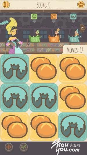 根据画面上方的面包店工人们和手上篮子的颜色来消除,不同颜色的工人对应同色面包,最终使各色工人都把自己的面包篮子装满后,你就算过关了。