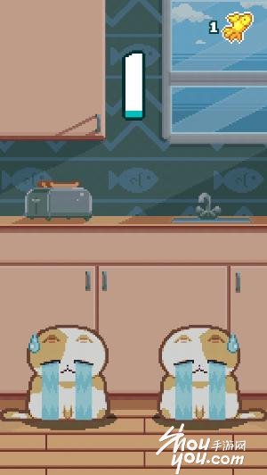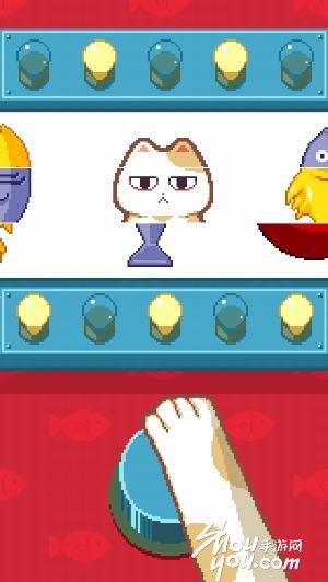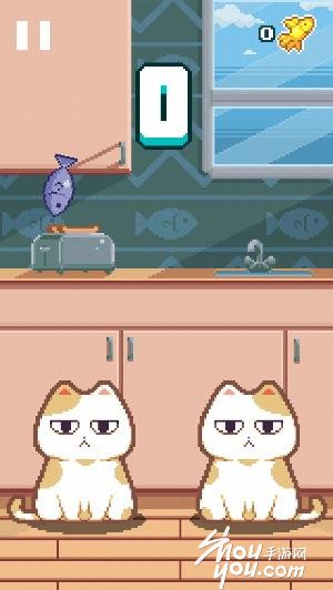 每当旁边抛出一只鱼掉到猫的嘴里你就要用手指按住屏幕让猫吃到鱼!要是鱼从猫嘴里“溜走”了就game over了。游戏中还会抛出一些炸弹,像《水果忍者》那样!如果不小心吃到炸弹,那么下场也是死!