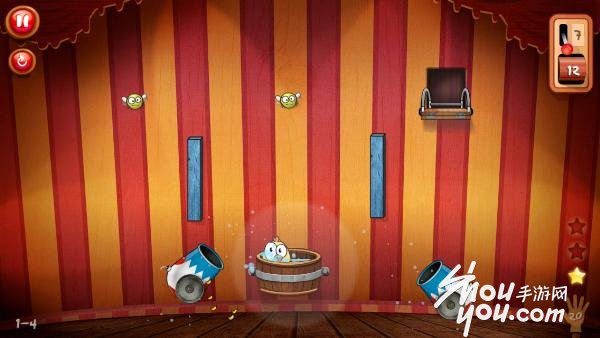 第一个关卡的任务就是让小鸡变成“落水狗”!只要让小鸡掉到水里就OK了!游戏的玩法是酱紫的:点击右上角的开关,小鸡就会从台上掉下来,在这之前,你必须移动内个“罐子”,把它放在适合的地方让小鸡可以掉进罐子里然后弹起来,能弹到水里就过关了!