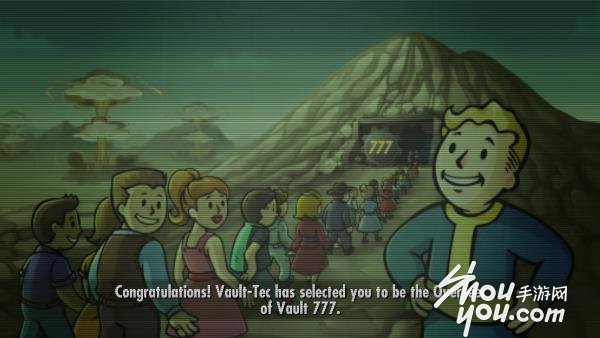 游戏的画面采用了官方漫画中的人物形象,风格与《辐射》系列形成统一的整体,既能够讨好老玩家,这样的漫画风格也非常适合于本作休闲经营的类型。在游戏的片头,黑白老电影式的 Fallout 标题 LOGO 就能唤醒老玩家沉睡7年之久的回忆,漫画形式描述简单的故事背景之后便可正式开始游戏。游戏共有三个存档位置,选择一个之后游戏会给玩家随机选择一个避难所编号,笔者这次抽到了497的号数(感觉不是很吉利呀!)。