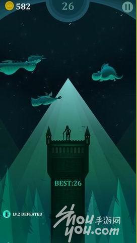游戏画面:画面一看就知道是休闲游戏,2D画面,画面主色调为浓厚的绿色和黑色,虽然基调比较阴暗,不过画面简洁给人感觉还算不错。场景是在一个月黑风高的夜晚,主人公是一个拿着长矛的骑士站在城堡的顶端,天空会飞过各种奇怪的巨龙。