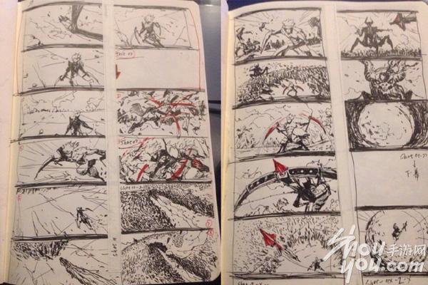 另外技能的释放特效,招式的连击效果等等以及游戏中的动画过渡做得也是非常有水准,比较偏向日系风格,把玩的时候脑子里只能蹦出两个字“酷炫!”。为证明开发者的用心,小编特地去网上找了几张分镜原稿和原画原稿。瞬间高大上有木有!恨当年没有好好学PS有木有!