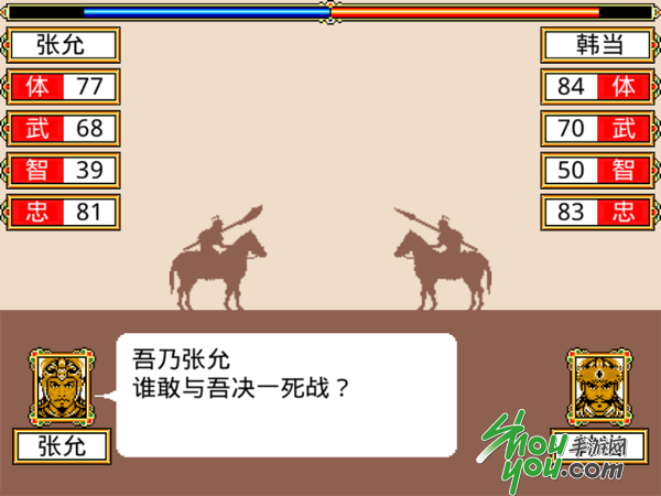 当然我们还能够直接对敌方部队发起进攻,当作战开始时,玩家有长蛇阵、鹤翼阵、锋矢阵和铁锹阵以供选择,不同阵型适用的场合也大大的不同。选好阵型后玩家还需要对各个兵种进行下令,命令可分为前进、包围、待机和后退四种,合理的把控进攻的节奏方能夺取胜利,当然如果对自己的武将有信心可直接通过战术发起单挑,若成功时即可无视双方队伍进行武将单挑。需要注意的是在单挑时若武将被斩杀则不会再复活,没有足够的把握不妨适时撤退以待援军。而在场面占优的情况下,可对敌方武将进行劝诱,如此来甚至能够在战斗中将敌方武将策反。
