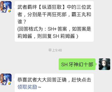 武者羁绊【纵酒狂歌】中的三位武者,分别是千两狂死郎,霸王丸和谁?(回答格式为:SH+答案