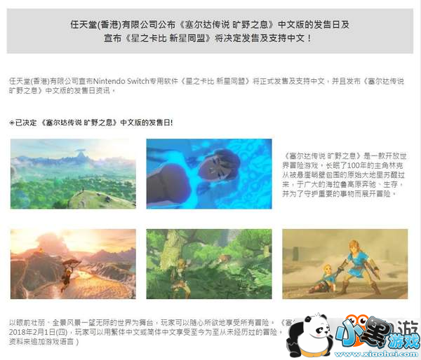 今日,任天堂(香港)有限公司公布了旗下游戏《塞尔达传说:荒野之息》中文版的发售日期,该作中文版将于2019年2月1日与广大的玩家们见面。