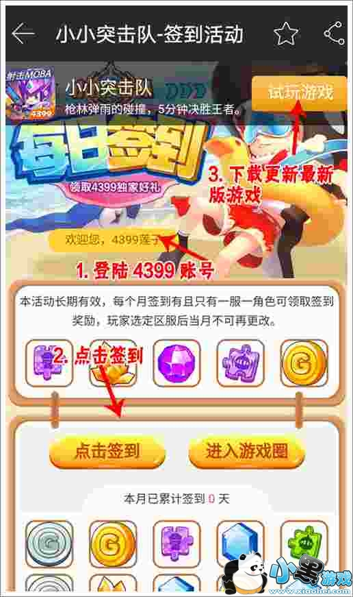 现在马上下载登录小黑游戏盒进行每日签到和签到满特殊天数分享,即可领取银币、皮肤碎片、晶石、宝石、英雄碎片等(到游戏盒,下载更新4399小小突击队最新版本才可以兑换该奖励)