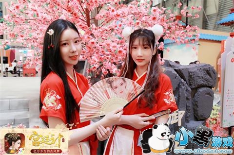 不同于其他展台,以唯美古风为亮点的《宫廷计》手游,展台ShowGirl们走的也是纯古风路线。衣红胜枫,肤白若雪,凤眼半弯藏琥珀,朱唇一颗点樱桃。