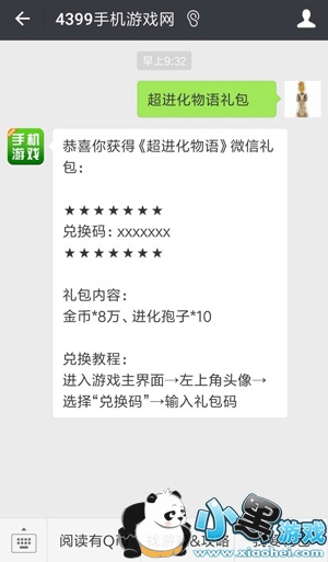 在4399手机游戏微信中,文字回复“超进化物语礼包”,就可以开始抢礼包码啦!