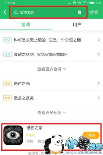 2.安装好后,打开好游快爆,点击右上角的搜索按钮,输入“怪物之家”,待游戏出现后点击旁边的【预约】按钮即可进行预约。
