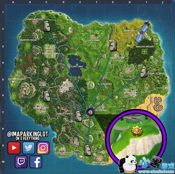 根据翻译,我们找到了堡垒之夜全地图共7处有人面巨石的位置,然后根据石头的面向衍生出蓝线,最终7处的蓝线交汇,由此青林判断,蓝线交汇处,就是星星所在的大概位置。