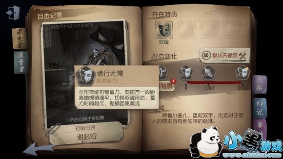【外在特质-双魂】:谢必安与范无咎寄魂于伞,可使用诸行无常转换灵魂。谢必安(白)擅长巡视追击,眩晕回复与攻击速度较慢,但是移动速度较快;范无咎(黑)擅长近身对抗,眩晕回复与攻击速度较快,但是移动速度较慢。