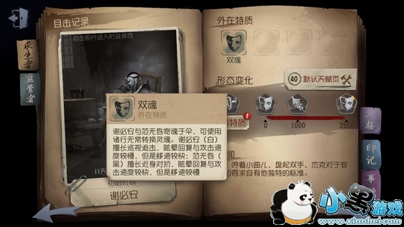 【形态特质-摄魂荡魄】:一阶解锁,谢必安(白)散魄轻身,进入摄魂状态,10秒内不可进行交互,但移动速度大幅提升并对身边的求生者持续摄魂。摄魂完成可使求生者进入失魂状态,目眩神迷,并且无法对其他求生者进行交互;范无咎(黑)驱动涤魂铃施展荡魄,铃声范围內的求生者需軎稳定心神进行校准判定,校准失败心神不稳则会进入落魄状态,叠加两层落魄状态会导致移动方向颠倒;